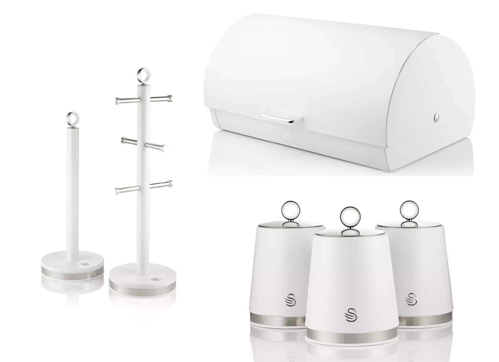 Swan Serenity White Bread Bin Canisters Mug Tree Towel Pole Kitchen Storage Set