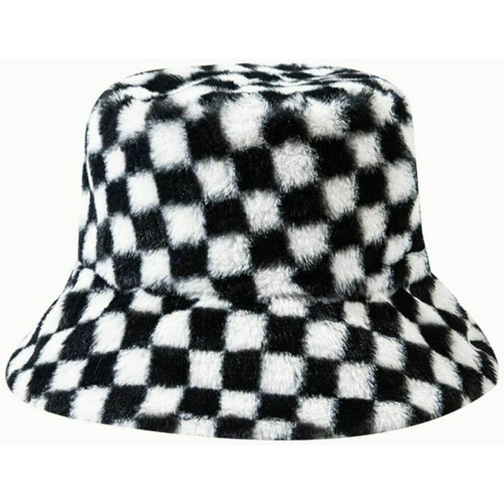 (Check Black & White) Winter Bucket Hat in Warm Fluffy Faux Fur
