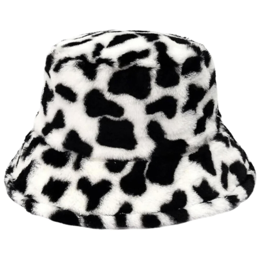 (Cow Black & White) Winter Bucket Hat in Warm Fluffy Faux Fur