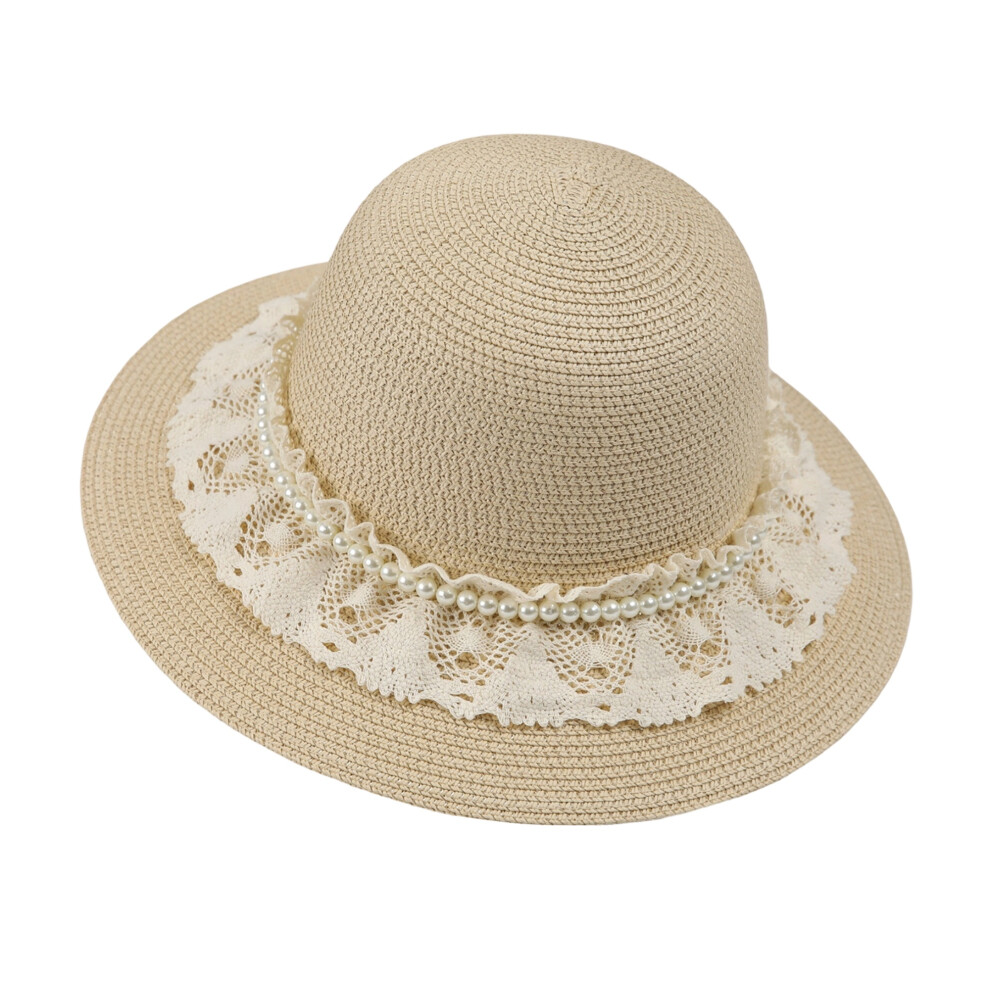(One Size, White) Women Straw Bucket Hat with Lace Trim Pearl Band Wide Brim Sun Cap Casual Summer Hat for Beach Travel Vacation