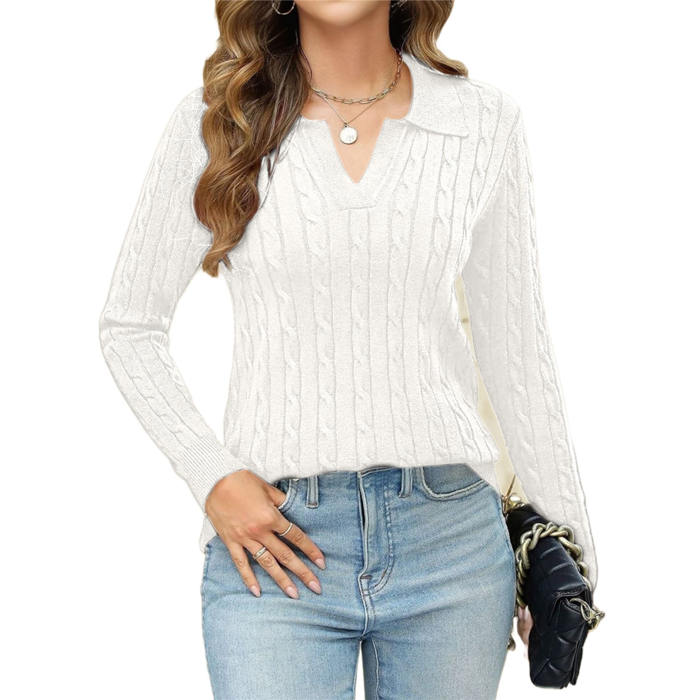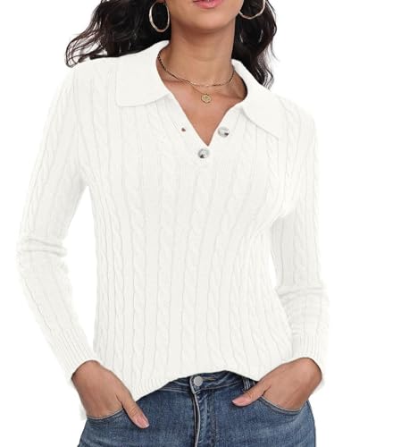 GRECERELLE Womens Cable Knit Jumpers Long Sleeve Polo Neck Sweater Tops Casual Pullover Polo Shirts 2025 Fall Fashion Outfits (White, L)
