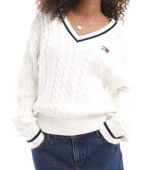 Tommy Jeans Womens Jumper Sweater Size 8/10 White Cable Knit V-neckline New