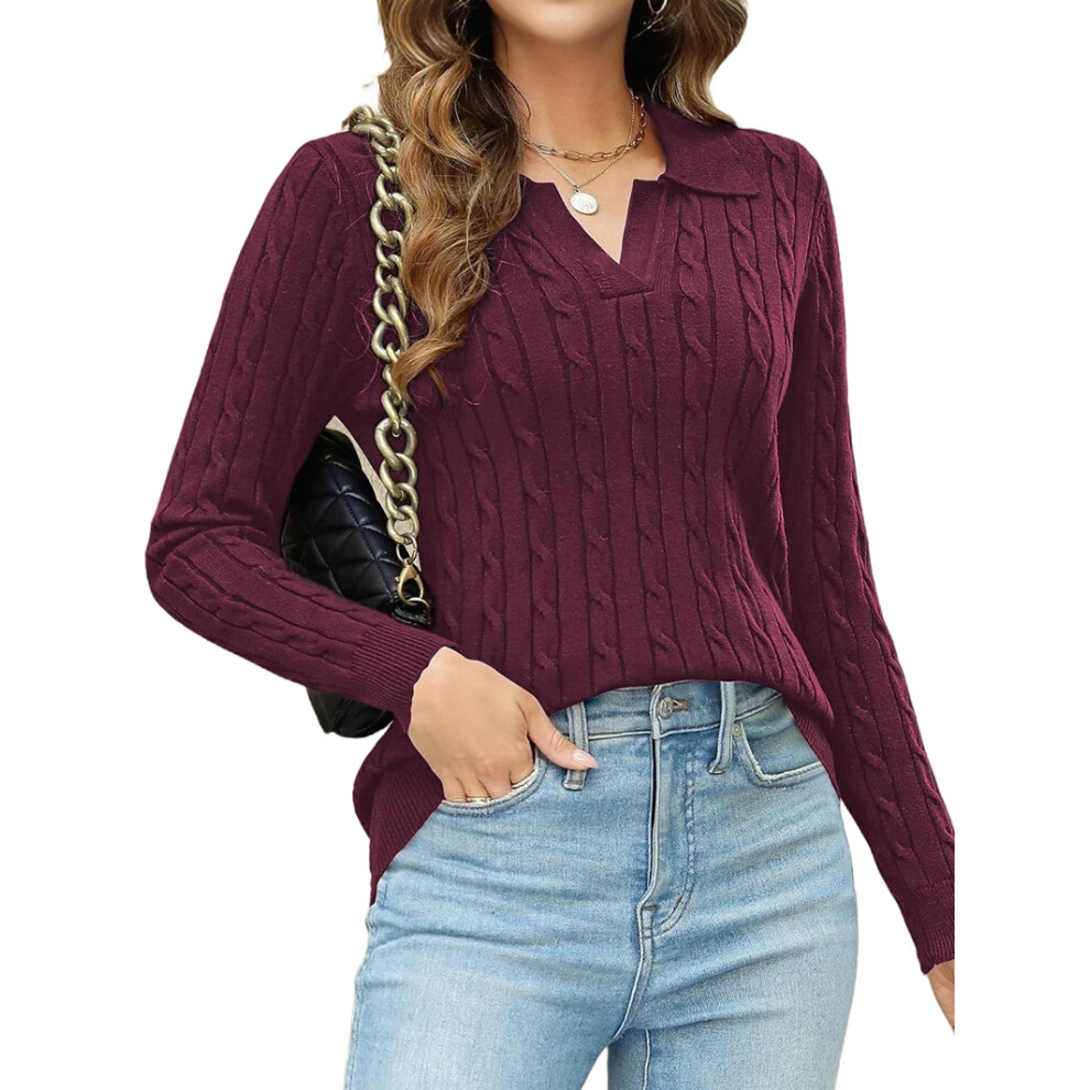 (M, Wine Red) Womens Long Sleeve Sweater Tops Lapel V Neck Loose Shirts 2025 Autumn Cable Knit Business Casual Outfits White S