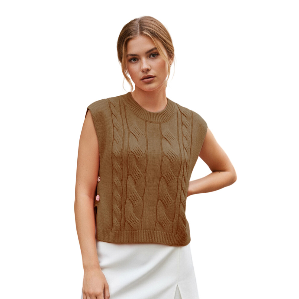 (M, White) Womens Cable Knit Sweater Vest Loose Solid Crew Neck Sleeveless Side Split Button Tops for Daily Office Party