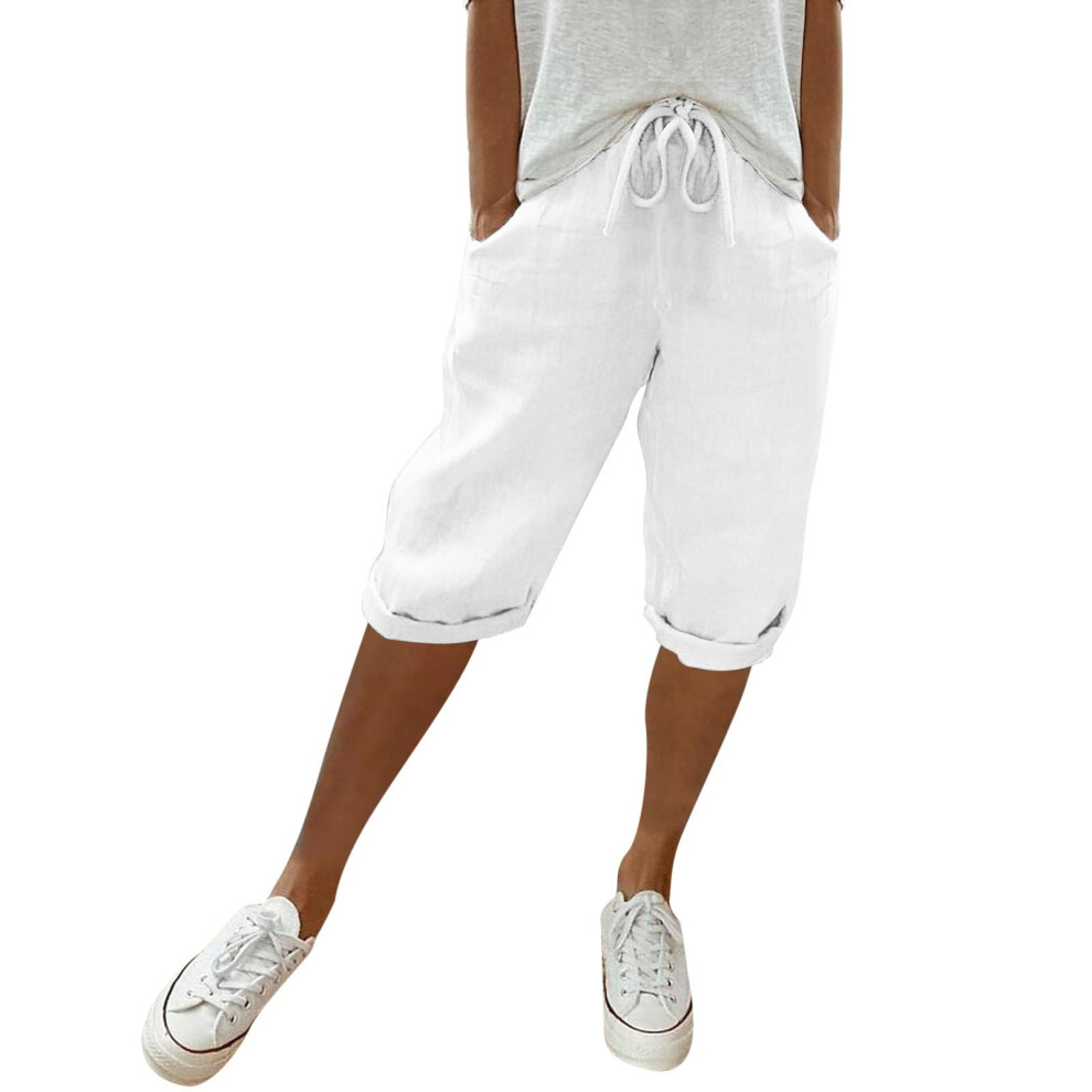 Famulily Ladies Casual Cotton Linen Trousers Elastic Waist Plus Size Capri Pants with Drawstring White XXL