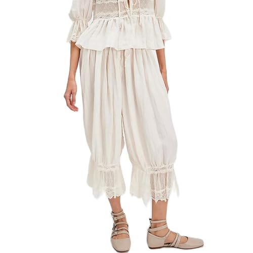 ThiCc Women's Long Bloomer Pants - Lace Trim Victorian Pantaloons Y2K Elastic Waist Maid Ruffle Pumpkin Trousers Comfortable Lounge Mid Rise Capri for Home Daily Relaxation (Creamy White,M)