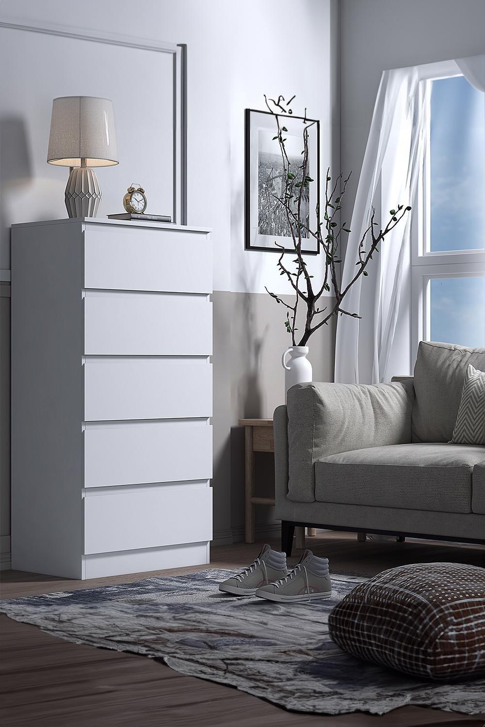 Panana Modern 4/5 Chest Of Drawers with Metal Runner Wooden Bedroom Storage Cabinet Cupboard Unit For Hallway Living Room Furniture (White, Chest of 5 Drawers)