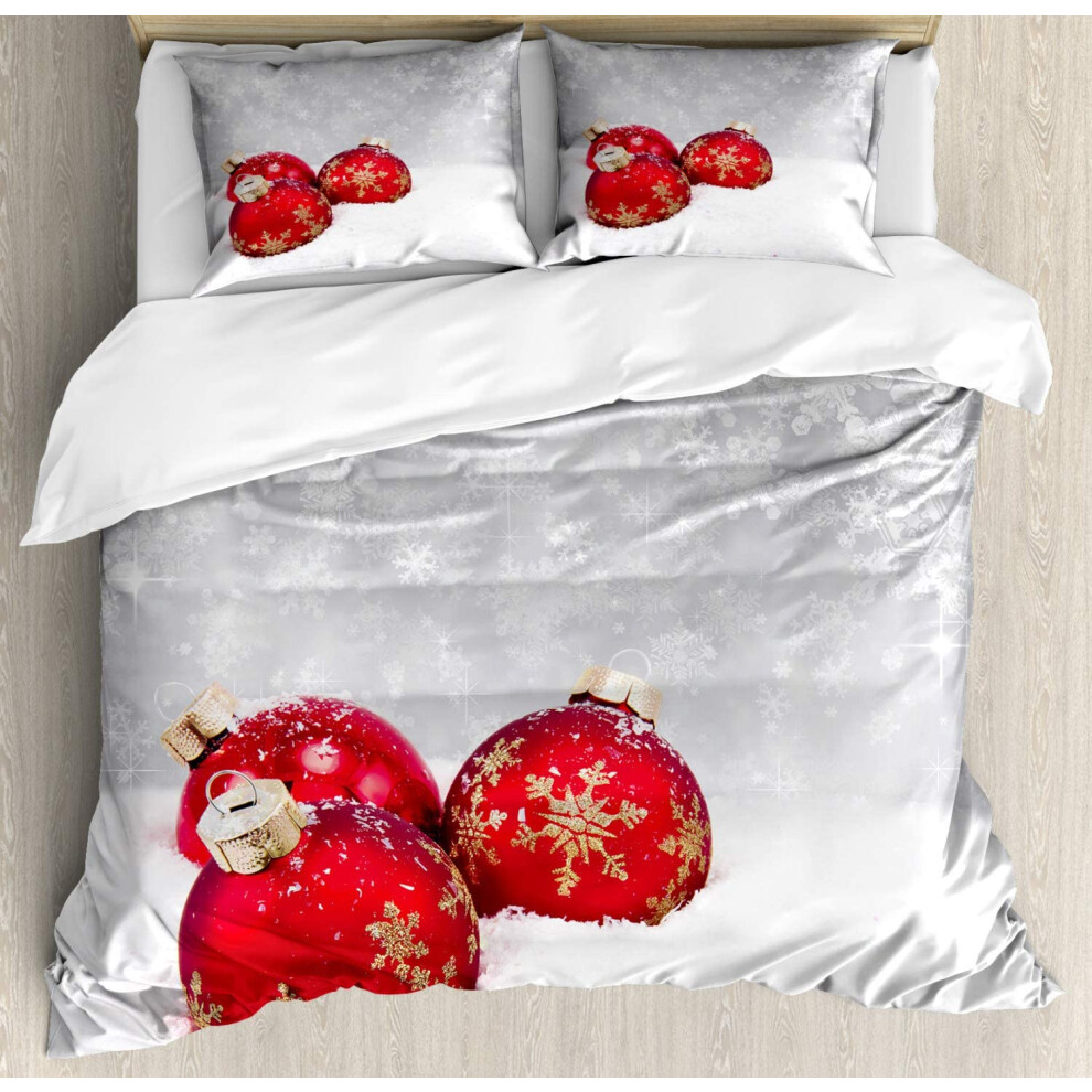 Christmas Duvet Cover Set, Xmas Baubles on Snow Snowflakes Ice Holiday Art, 3-Piece Bedding with 2 Pillowcases, White Red