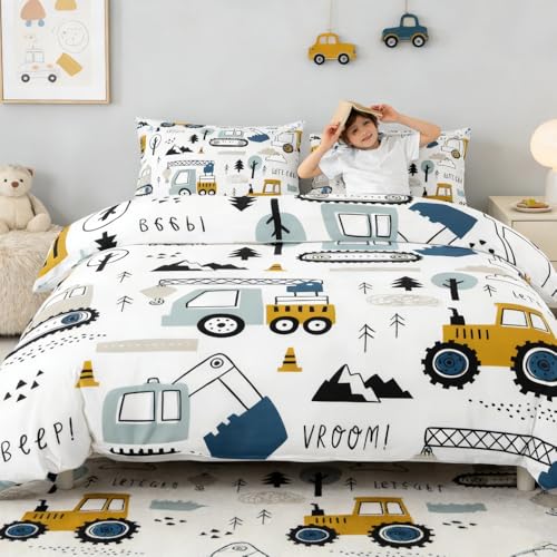 Loussiesd Cartoon Car Kids Bedding Set Construction Duvet Cover for Gift Boxes Christmas Decor Equipment Trucks Comter Excavator Tractor White Yellow Bedspread Bedroom Single 2Pcs