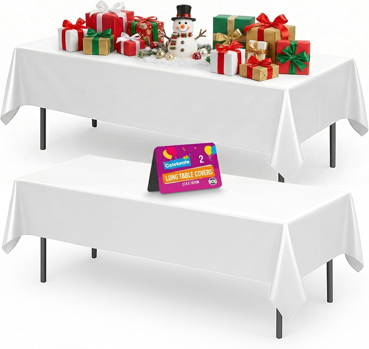 SOL 4pk Long White Table Cloth Party 274x137cm Rectangle Plastic Cover Disposable Tablecloths for Parties - Heavy Duty Spill Protection - Christmas Decorations New Year 2026 Birthdays Weddings Buffet