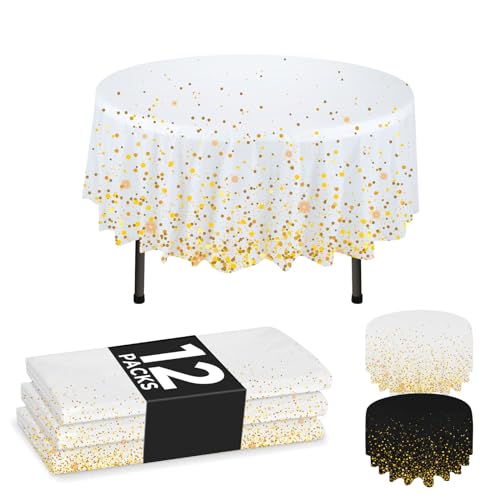 NORZEE 12-Pack White Disposable Plastic Tablecloths, 84" Plastic Table Cloth, Round Table Cover Gold CONFETY (12, White Gold)