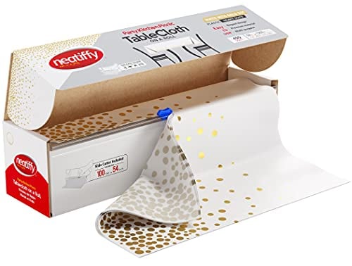 Neatiffy Disposable Plastic Table Cloth Roll, Party/Banquet Table Cover, Tablecloths for Rectangle/Round/Square Tables, Equals to 12 Picnic Pack (54 Inch x 100 Feet, White Golden Dot)