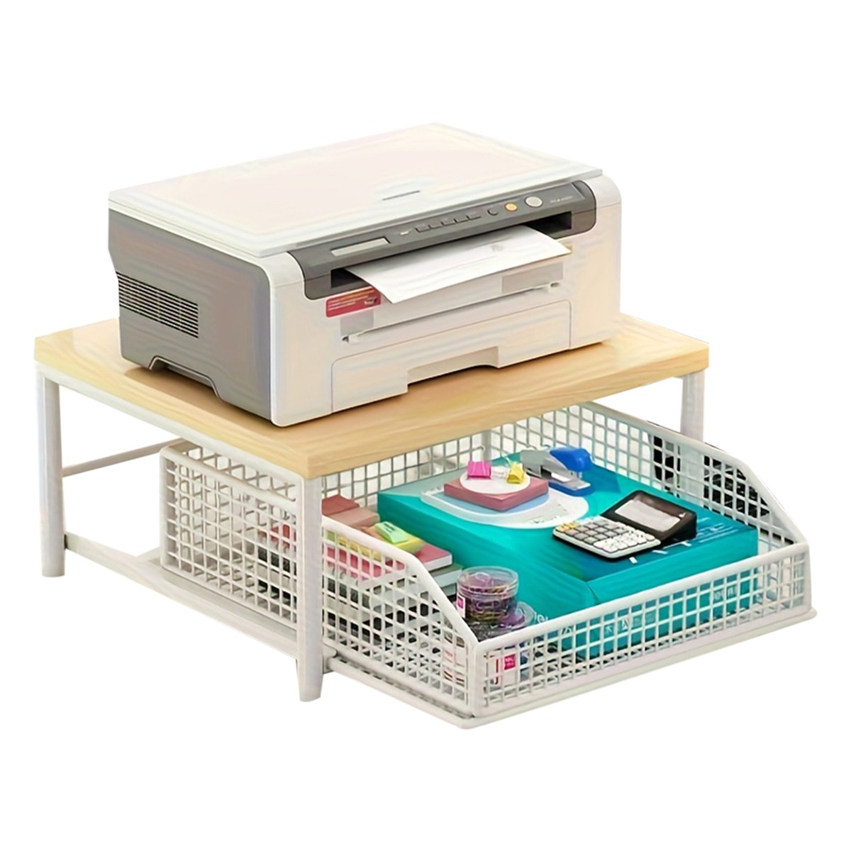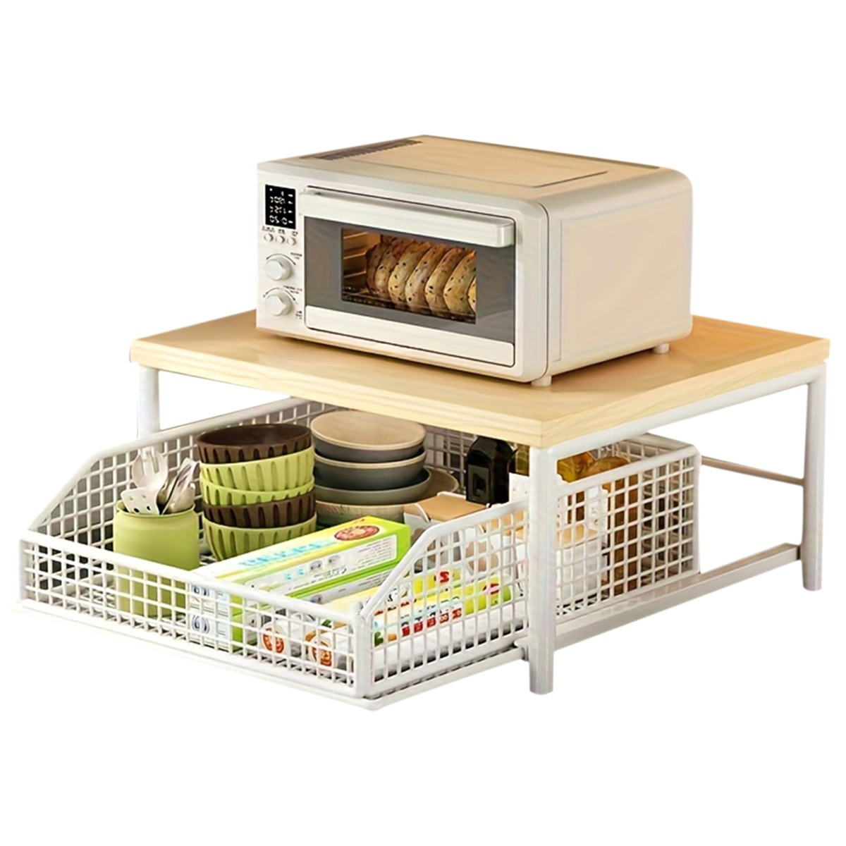 Countertop Organizer for Kitchen, Double Layer Kitchen Microwave Stand with Wood Countertop, Shelf Sliding Drawer Organizer for Coffee Maker Toaster, Supplies in Kitchen Office Dorm (White)