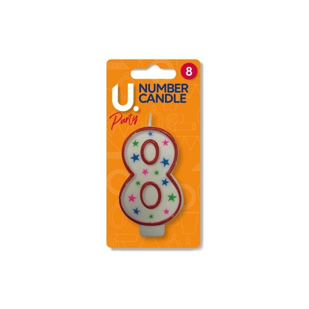 (8) Birthday Cake Number Candles 0 - 9 All Ages White And Red With Coloured Stars