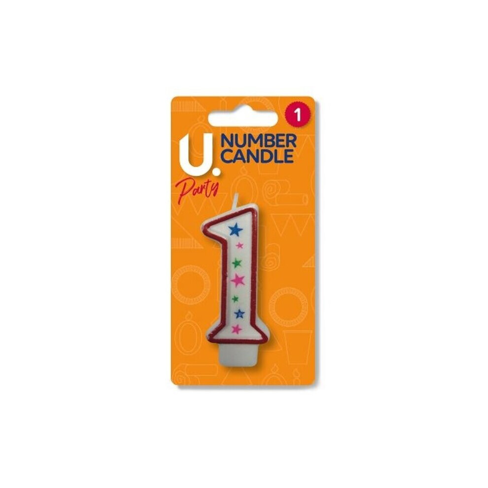 (1) Birthday Cake Number Candles 0 - 9 All Ages White And Red With Coloured Stars