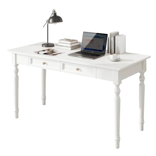 BaoBaJiu Solid Wood Desk with Drawers, 120cm Large White Computer Desk, Executive Writing Table for Home Office, Shabby Chic Farmhouse Style
