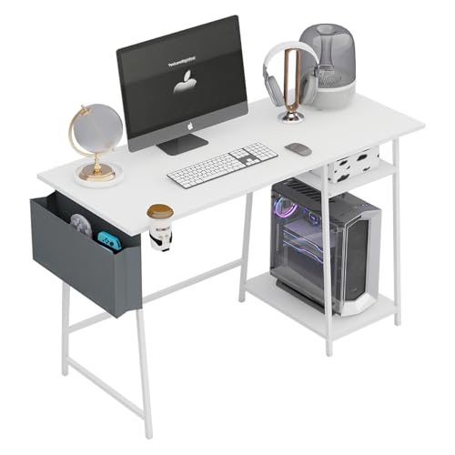 Lufeiya White Computer Desk, Office desk with drawers,Small Computer desk 120cm with Storage Bag for Home Office Writing