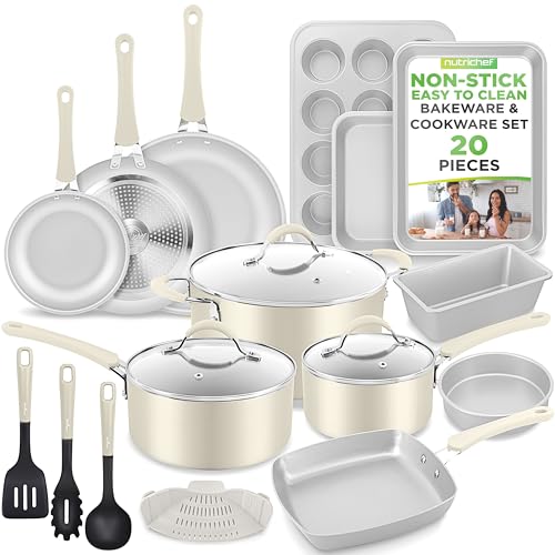 Nutrichef Pots and Pans Set, 20 Piece Bakeware and Cookware Set, Induction Hob Pots Set w/Lids, Non Stick Set, Heat Safe Silicone Handles, Saucepan, Frying Pans, Muffin Tin, Cookie Tray, Utensil-White