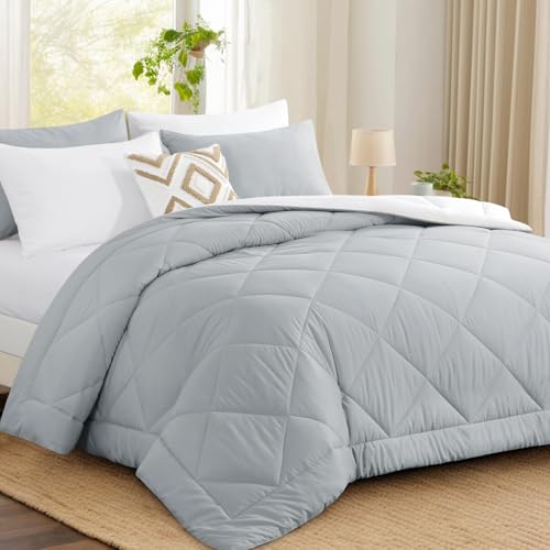 Aisbo Coverless Duvet Single 10.5 Tog - 135x 200cm, Grey Cosy and Lightweight Quilt, Reversible Comforter with Pillowcase, Grey/White