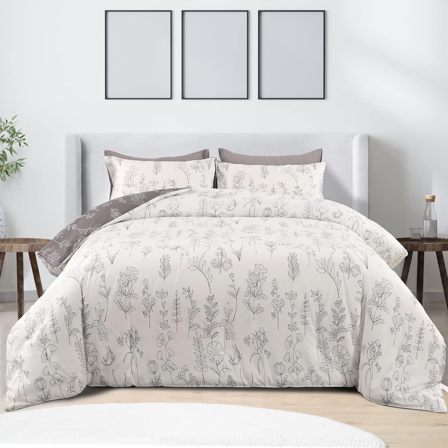 Qucover 3-Piece Coverless Duvet Double, Reversible Grey and White Floral Botanic