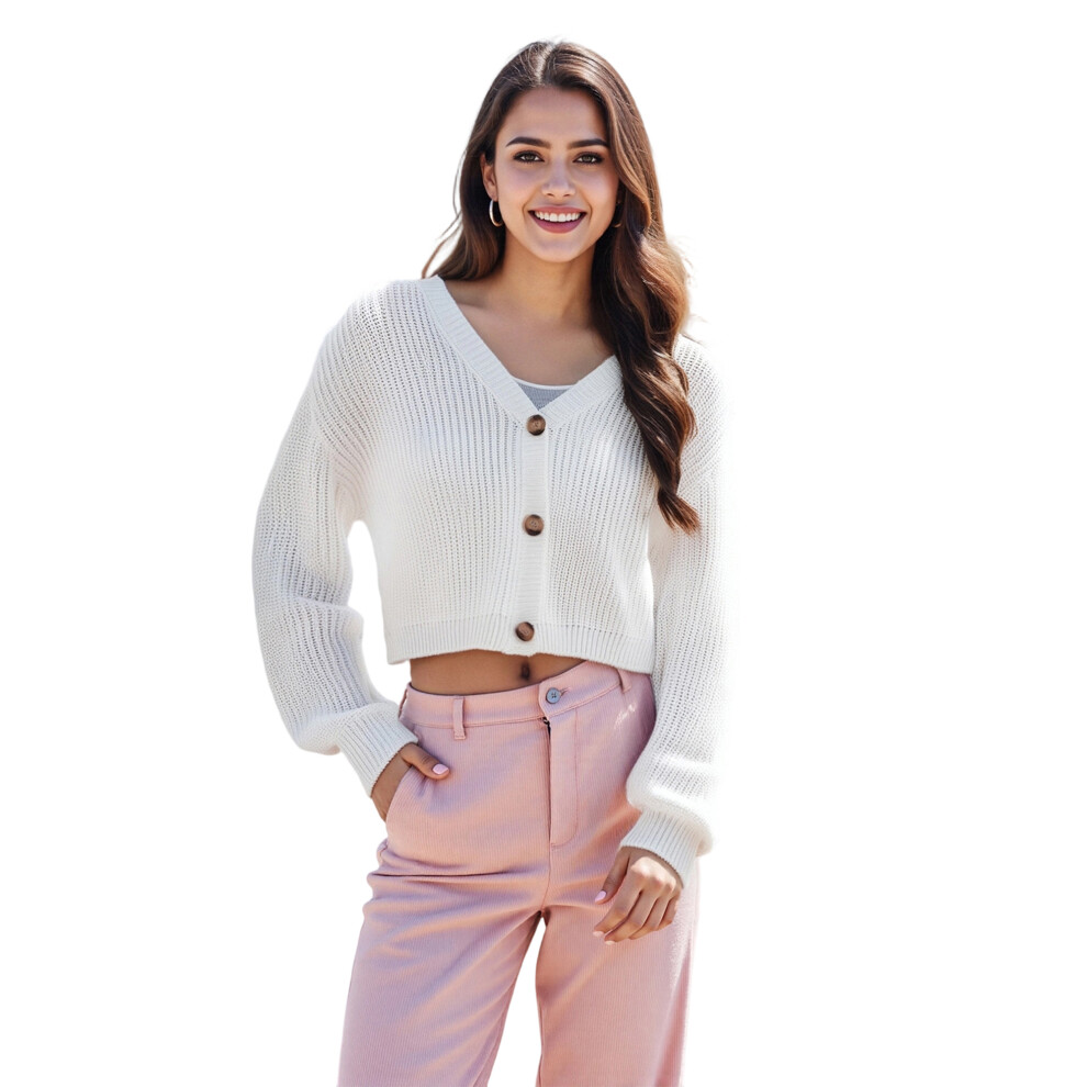 BERESIA Cropped Cardigan for Ladies Womens V-Neck Sweater Long Sleeve with Buttons Elegant, White M