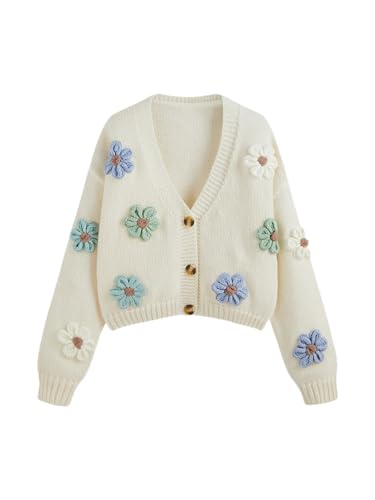 CIDER Women’s Floral Cropped Cardigan Cute Flower V Neck Button Down Trendy Sweater, White, Small