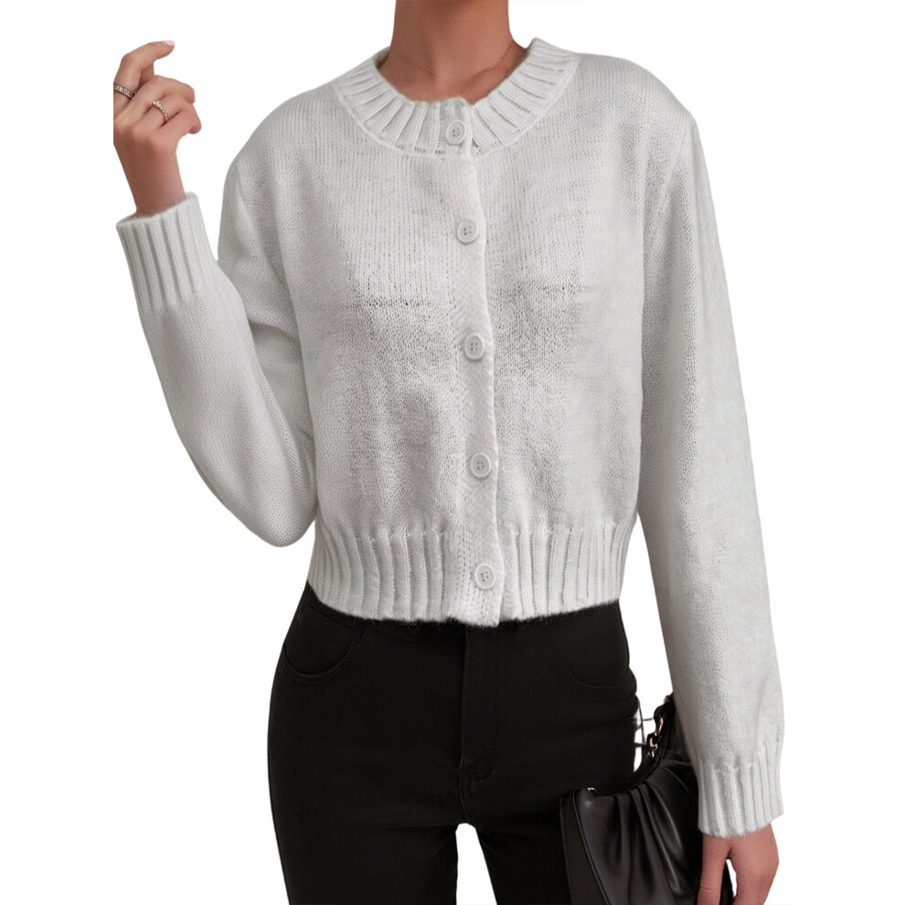 (L, White) Women's Cardigan Casual Button Down Fall Long Sleeve Crew Neck Cropped Knit Sweater Jacket