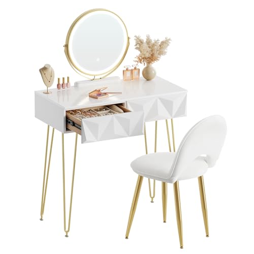EUGAD Dressing Table with Velvet Stool, Make-up Table with 360° Swivel Mirror and 3-Level Adjustable LED Light, White Desk with 2 Drawers, White + Golden, 0056SZT