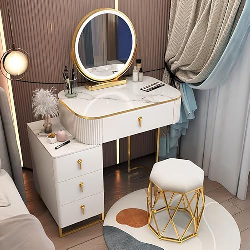 WSJJXS Dressing Table with Mirror and Stool, White Vanity Desk with Drawers for Bedroom, Makeup Desk with LED Lights/Wireless Charging/USB Charging Port/Bluetooth speaker