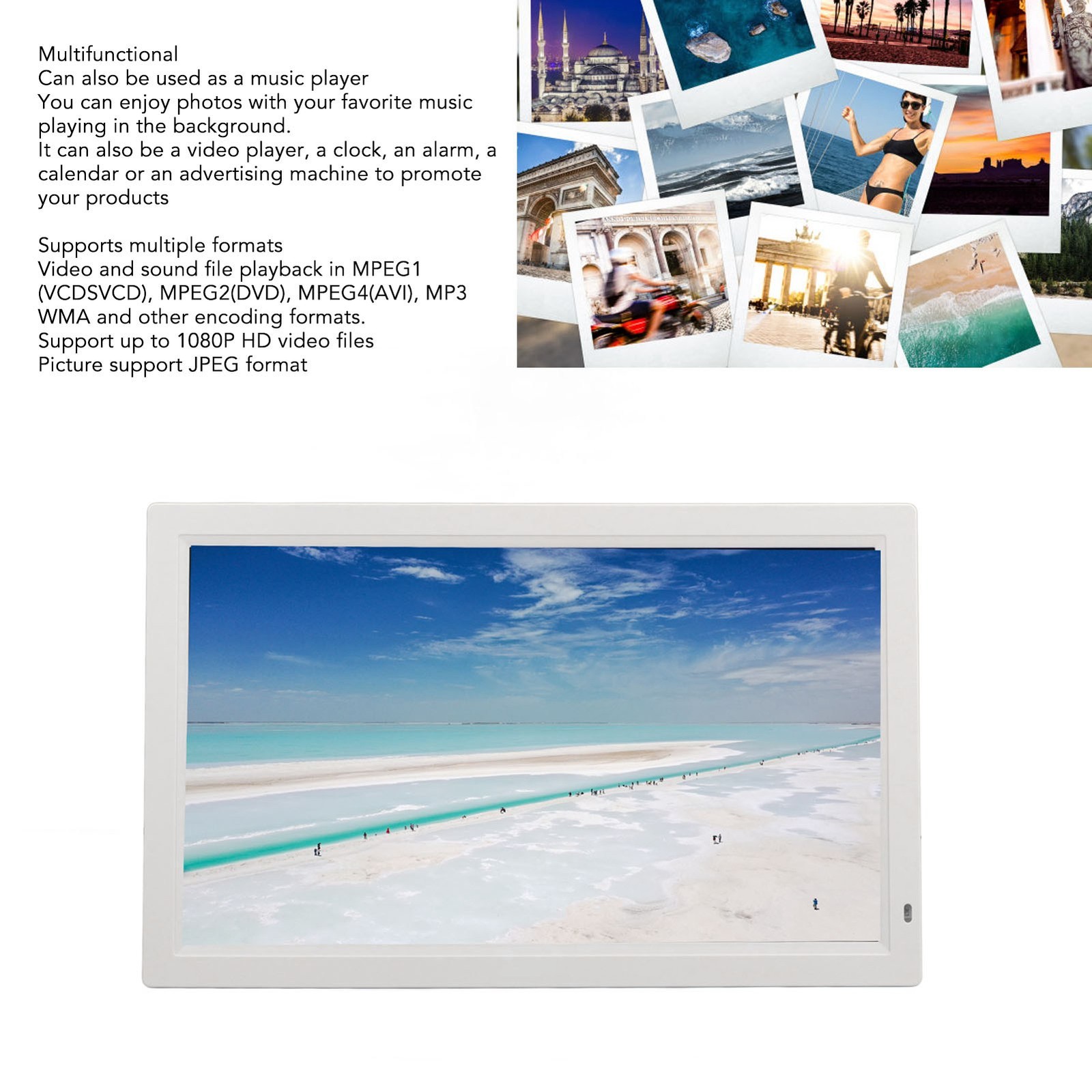 Digital Photo Frame 19in Screen White Music Clock Calendar Functions Picture Fra