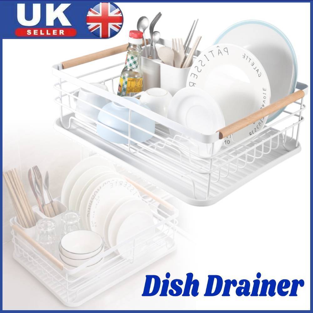 Large White Kitchen Dish Drainer Rack With Drip Tray Cutlery Cup Plate Holder UK