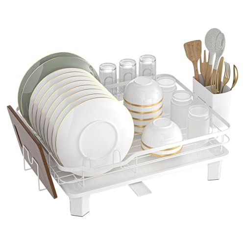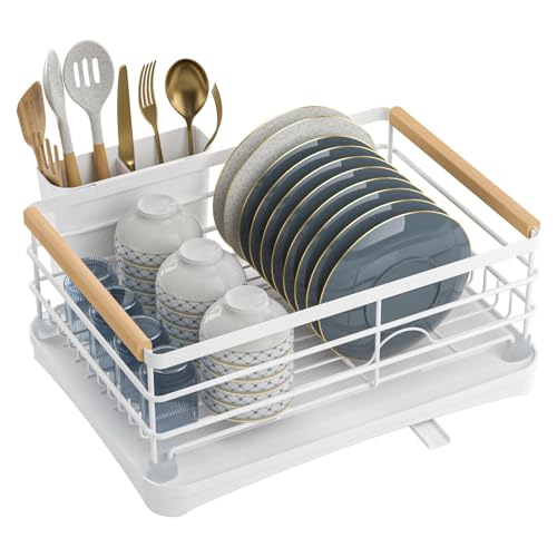 Dish rack drainer, Anti-Rust White metal dish drainer rack with dip Tray, Separate Cutlery Holder, White and wood dish drainer Wooden Handles Dish Drying Rak for kitchen Countertop Easy Clean Assembly