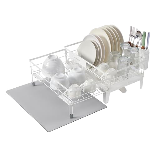 APPASO White Dish Drainer Rack, Stainless Steel Rust-Resistant Space Saving Kitchen Dish Drying Racks with Cutlery Holder, Drip Tray & Cup Holder, Perfect for kitchen storage & Organization