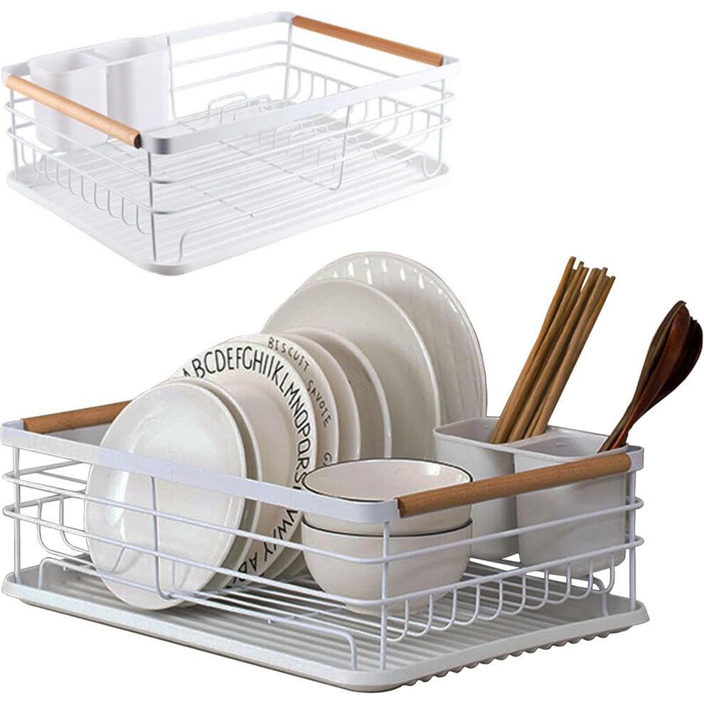Dish rack drainer Anti-Rust White metal dish drainer rack with dip Tray Separate Cutlery Holder Wooden Handles Dish Drying Counter top Easy Clean