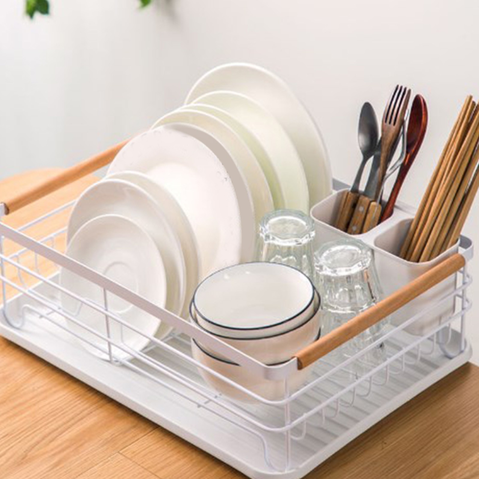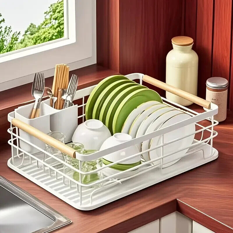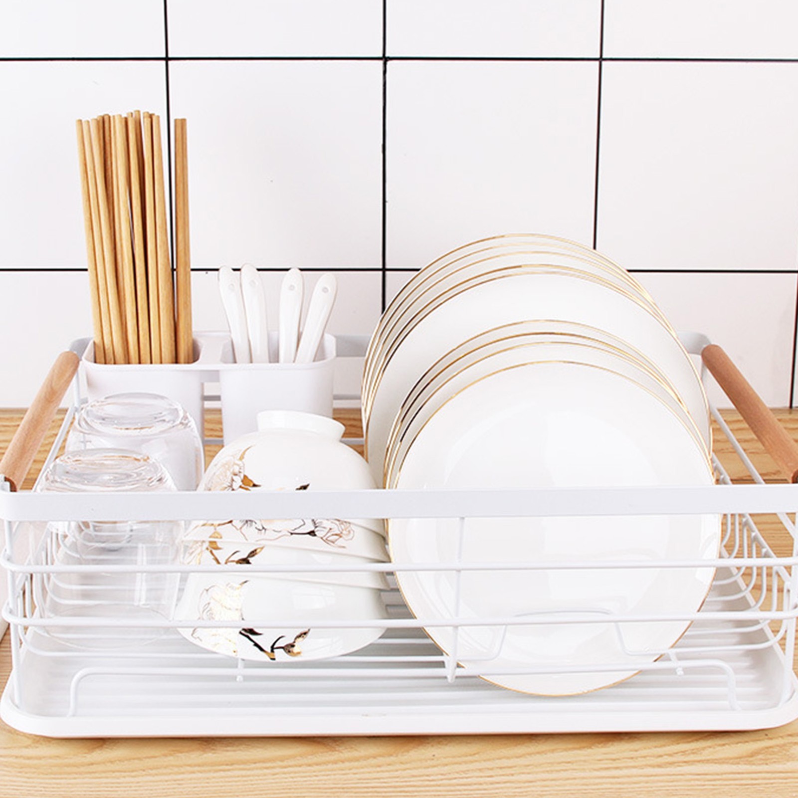 Warmiehomy White Dish Drainer Rack Metal Draining Board Rack Dish Rack with Removable Drip Tray, Sink Drainer Rack for Kitchen with Removable Cutlery Holder Wooden Handles, White