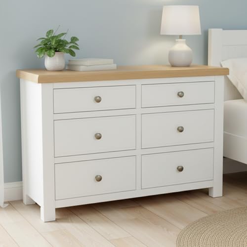 GROF GROFurniture Snow White Chest of Drawers Bedroom, 6 Drawer Storage Chest for Bedroom Storage Organiser, Solid Wood Storage with Oak Top, Ready Assembled