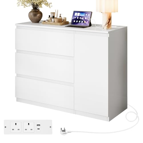 Feonase White Chest of Drawers Bedroom with Charging Station and Open Shelving | Multifunctional Drawer Cabinet for Bedroom and Living Room 90x68x36cm
