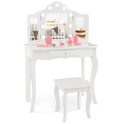 COSTWAY Kids Vanity Table and Stool Set, 2 in 1 Princess Makeup Dressing Tables with LED Lightes, Tri-Fold Mirror, Drawer, Wooden Children Study Desk Chair for Toddlers (White)