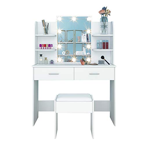 loyliawa Dressing Table, Vanity Desk with Sliding Mirror and Lights, Bedroom Dressing Tables, Makeup Table with Drawers & Shelves for Living Room Bedroom Girl Women (White 2.0)