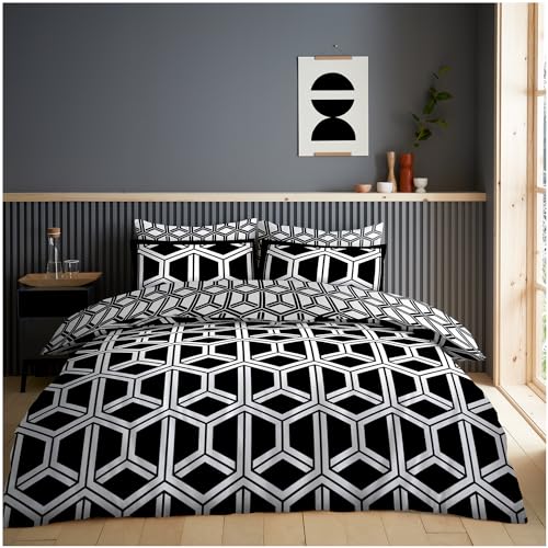 FAIRWAYUK Duvet King Size Covers Set - Poly Cotton Hotel Quality Reversible Greek Key Printed Quilt Cover with Pillowcase, Ultra Soft White and Black