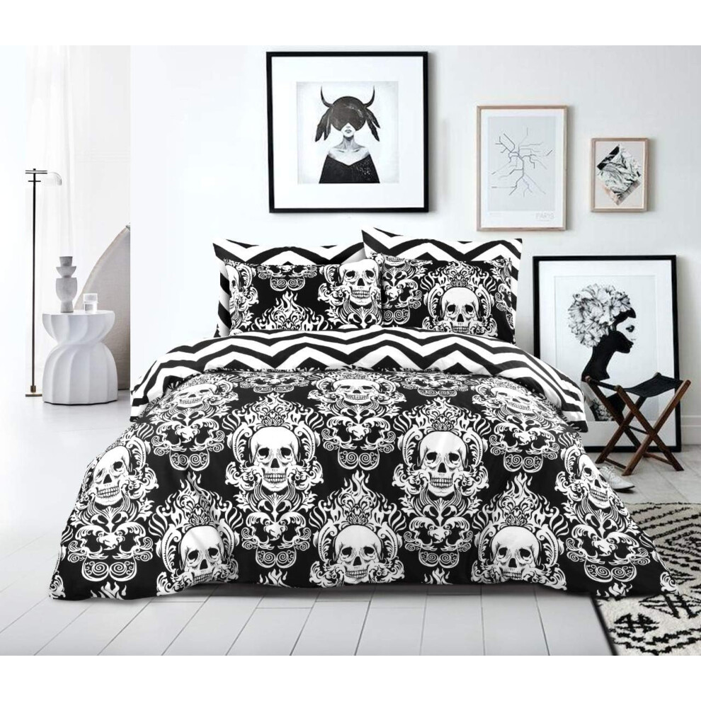 MK Home Textile King Size Duvet Cover Set Black Skull Reversible Cotton Bedding White Stripe Quilt Covers with Pillow Cases Double King SuperKing Bed
