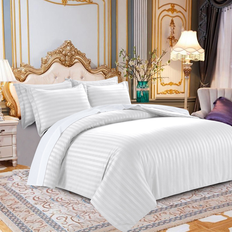 (King, White) Stripe Duvet Covers Bedding Set Fitted Sheet & Pillowcase