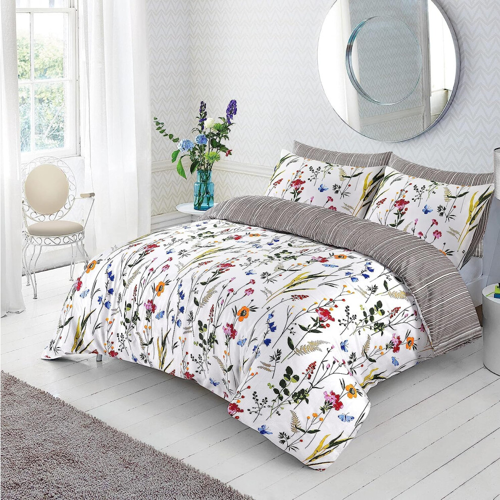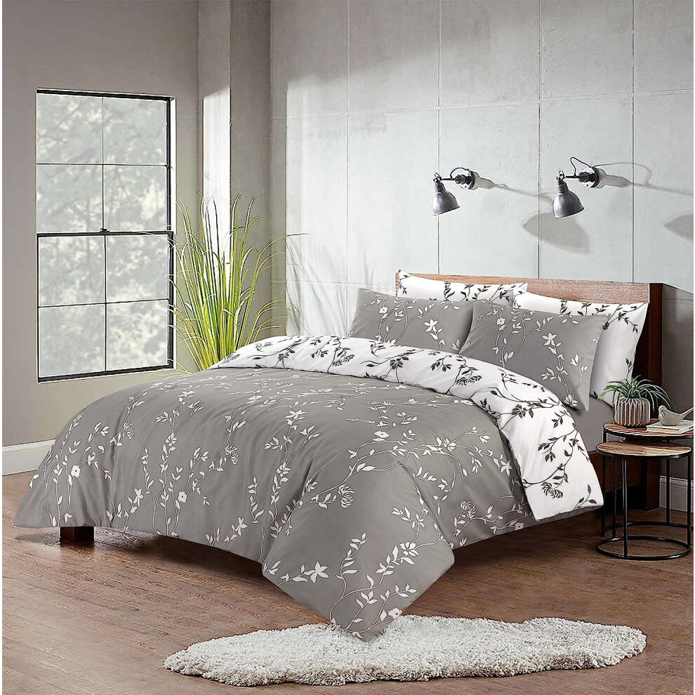 Floral Duvet Cover Set 200 Thread Count Reversible White/Silver/Grey Luxury Printed Bedding Sets | 100% Cotton Quilt Covers Double King SuperKing