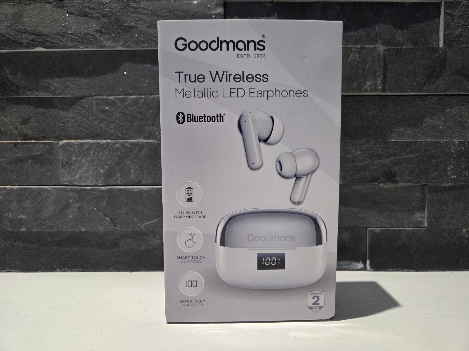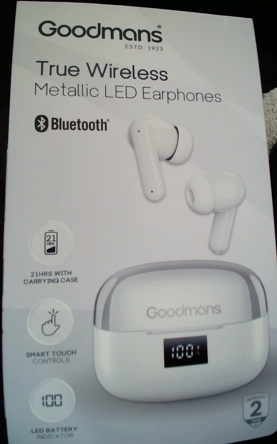 Goodmans True Wireless Metallic LED Earphones. White. 21 Hrs. Smart Touch. New.