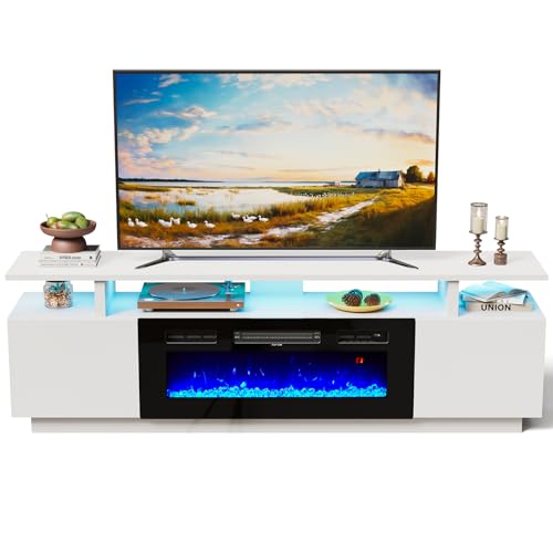 INMOZATA Electric Fireplace TV Stand, Entertainment Center Console Table for 75" TVs with RGB LED Lights, Electric Fire with Remote Control, 12 Flame Colors, Adjustable Thermostat, 900W&1800W-White