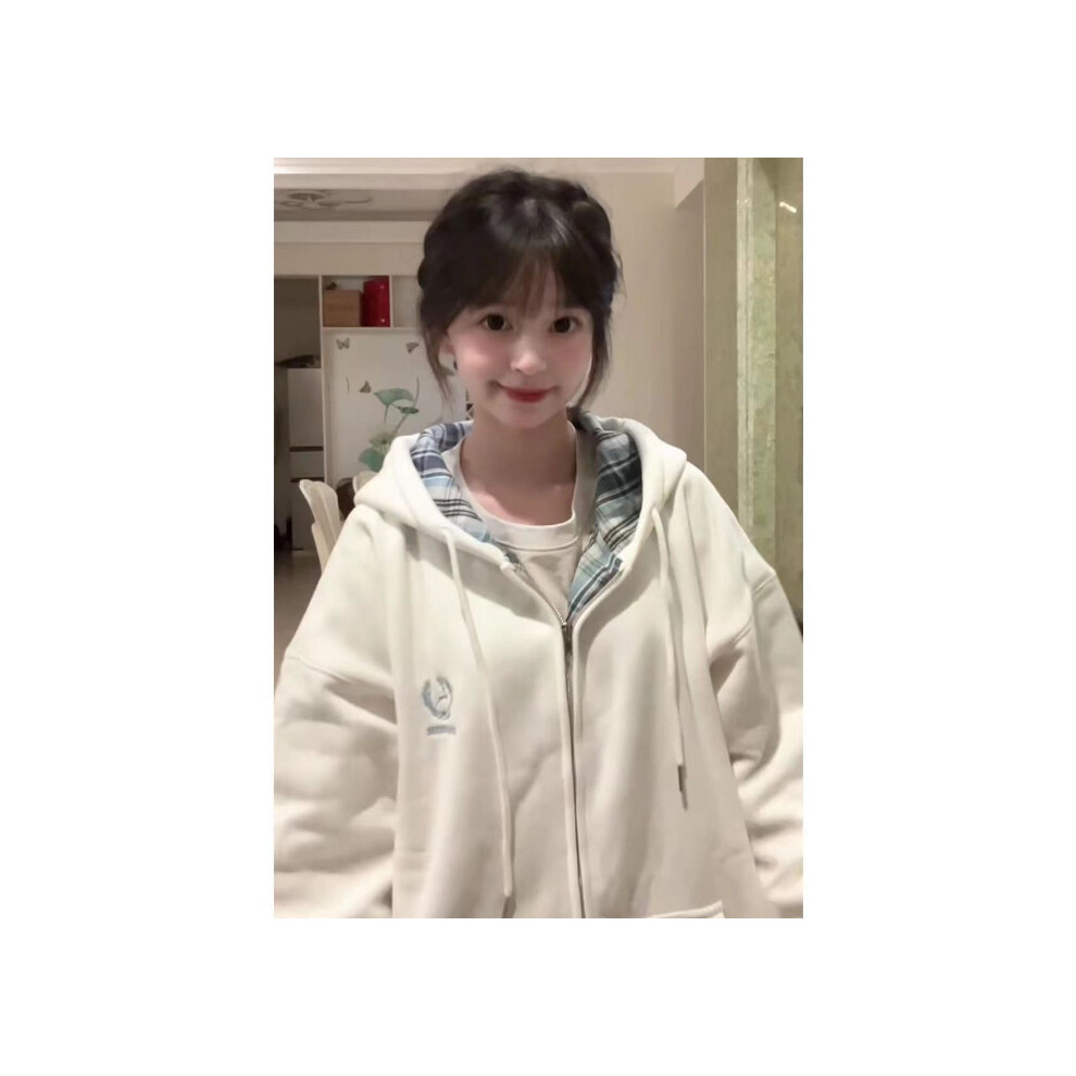 (White (Silver Fox Fleece) Thickened & Lined, L) 2025 Autumn and Winter New American Street Style Plaid Patchwork Hoodie for Women, Casual Trendy Bran