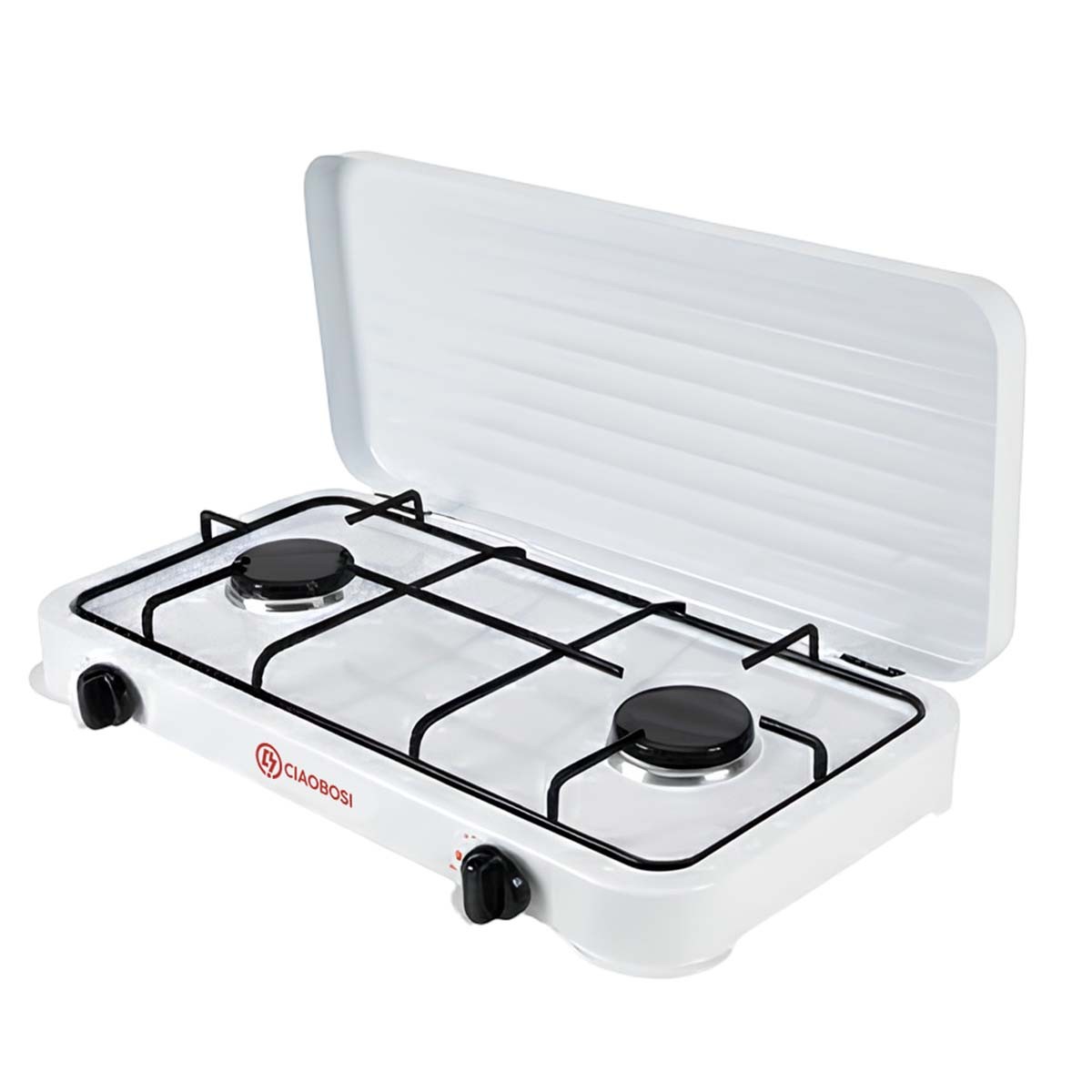 Avizar Manual Ignition Double Burner Gas Stove with Foldable Lid, White