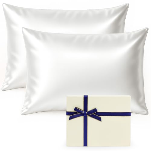 tenn well 2 Pack 100% Mulberry Silk Pillowcase Both Sides, 19 Momme Pure Silk Pillowcase for Hair and Skin, Soft & Smooth with Hidden Zipper (Standard 51 x 76cm, White Includes Gift Box)