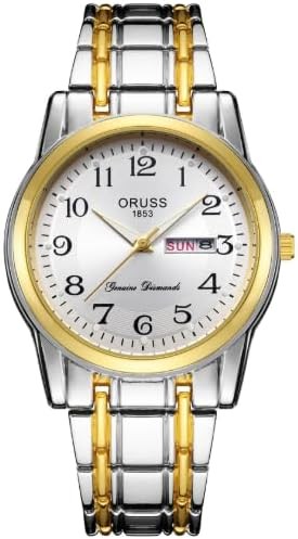 Men's Gold and White Watch in Gift Box – Stainless Steel Two-Tone Bracelet, Quartz Movement, Day-Date Display, Water Resistant Dress Watch with Gift Box – Elegant Business Casual Timepiece