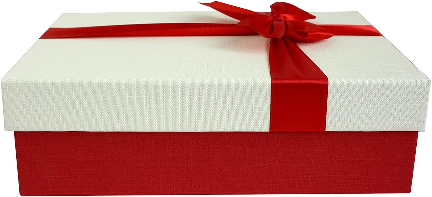 Emartbuy Cream Paper + Red White Rigid Gift Box with Ribbon – 33.5 x 25 x 11.